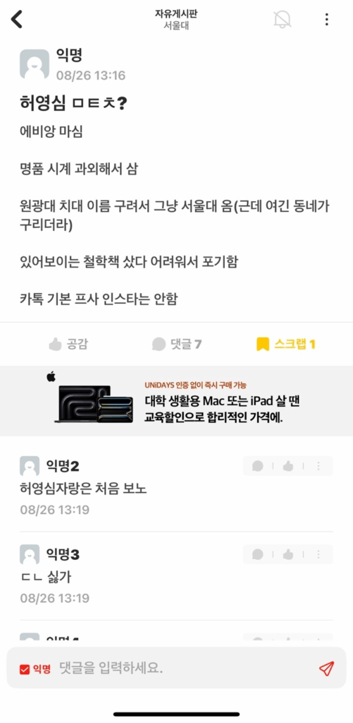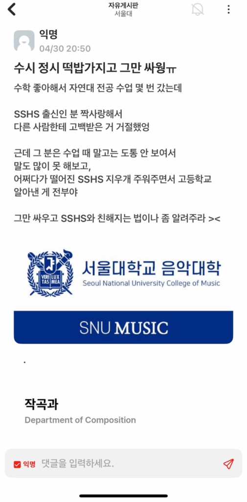 ์ •๋ง ์˜ค๋žœ๋งŒ์— ์—๋ธŒ๋ฆฌํƒ€์ž„์„ ๋ดค๋Š”๋ฐ ์žฌ๋ฐŒ๋Š” ๊ธ€๋“ค์ด ๋งŽ์•˜๋‹ค. ๊ทธ ์ค‘ ์ผ๋ถ€๋ฅผ ์ฒจ๋ถ€ํ•œ๋‹ค. ๊ทธ๋ ‡๋‹ค. ๋‚˜๋Š” ๋‚ด ์ผ๊ธฐ์˜ ์žฌ๋ฏธ๋„๋ฅผ ๋†’์ด๊ธฐ ์œ„ํ•ด ๋…ธ๋ ฅํ•˜๊ณ  ์žˆ์œผ๋ฉฐ, ๊ทธ๋Ÿฌ๋ฏ€๋กœ ๋๊นŒ์ง€ ์ฝ์–ด๋‹ฌ๋ผ. SSHS๋Š” ์ •๋ง ๋˜‘๋˜‘ํ•˜๋‹ค. ๋‹น์žฅ ํ•™๊ณผ ๋‚ด์—์„œ๋„, ํ•™๊ต ๋‚ด์—์„œ๋„ ์‹ค๋ ฅ์˜ ํŽธ์ฐจ๊ฐ€ ์ •๋ง ์‹ฌํ•œ ๊ฒƒ์„ ๋‚˜๋Š” ํ•ญ์ƒ ์‹ค๊ฐํ•œ๋‹ค. ํ•˜์ง€๋งŒ ๊ทธ๋“ค์„ ์ˆญ๋ฐฐํ•  ํ•„์š” ๊นŒ์ง€๋Š” ์—†์œผ๋ฉฐ ์ข€ ๋งŽ์ด ๋˜‘๋˜‘ํ•œ ๋Œ€ํ•™์ƒ์ผ ๋ฟ์ด๋‹ค. fact.
